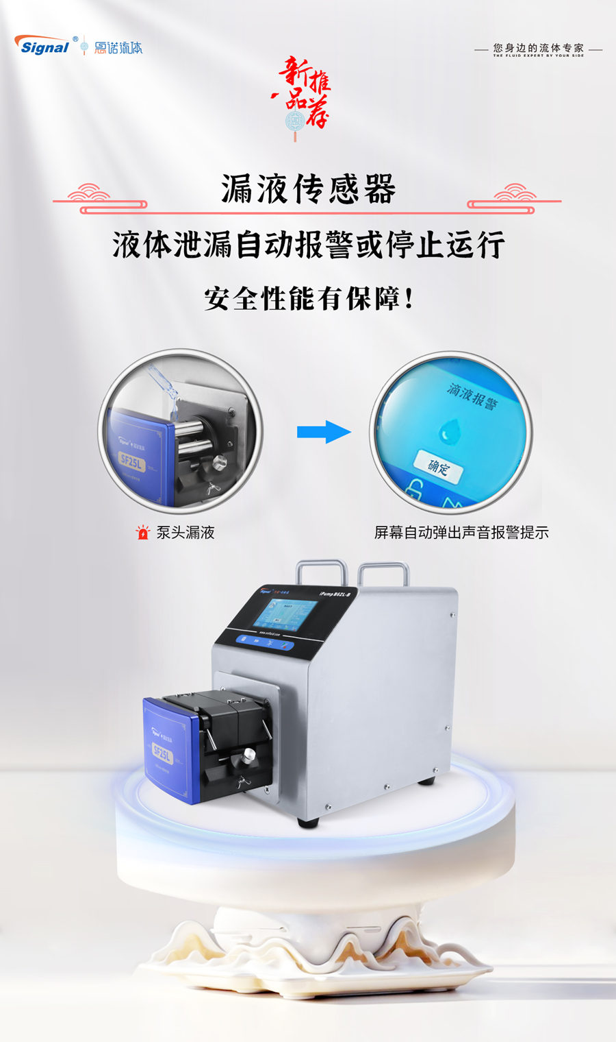 這款新品蠕動泵還配備了可選裝的漏液傳感器。這一傳感器能夠?qū)崟r監(jiān)測泵頭內(nèi)部的液體泄漏情況,一旦檢測到泄漏,將立即觸發(fā)報警或自動停止泵的運行。